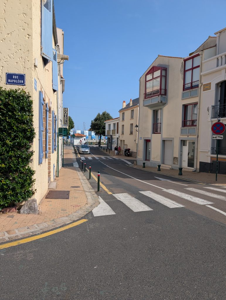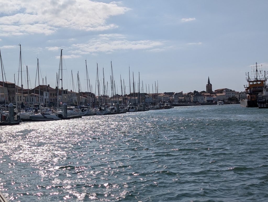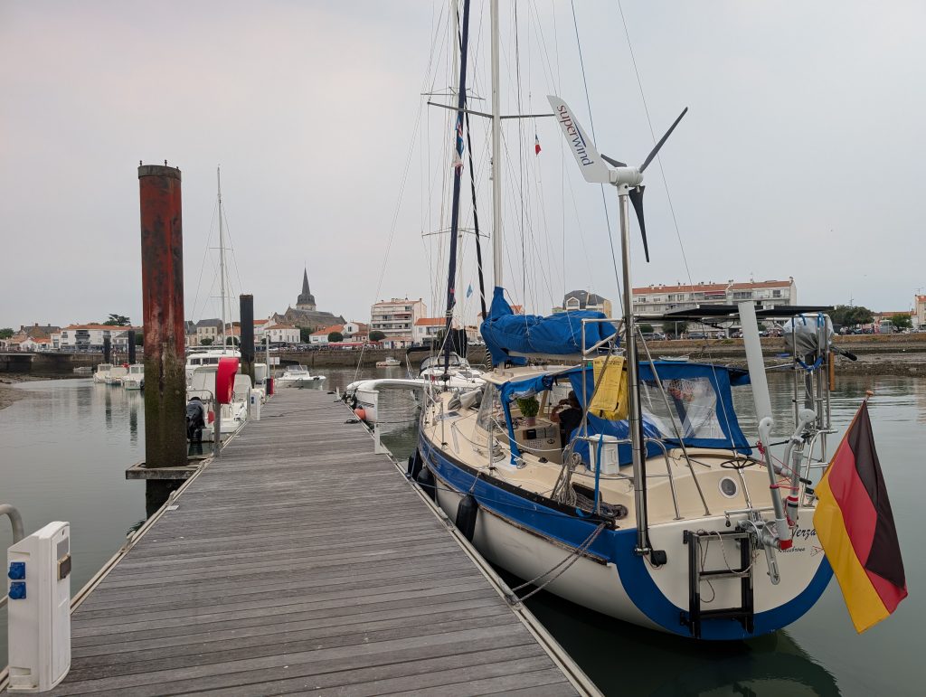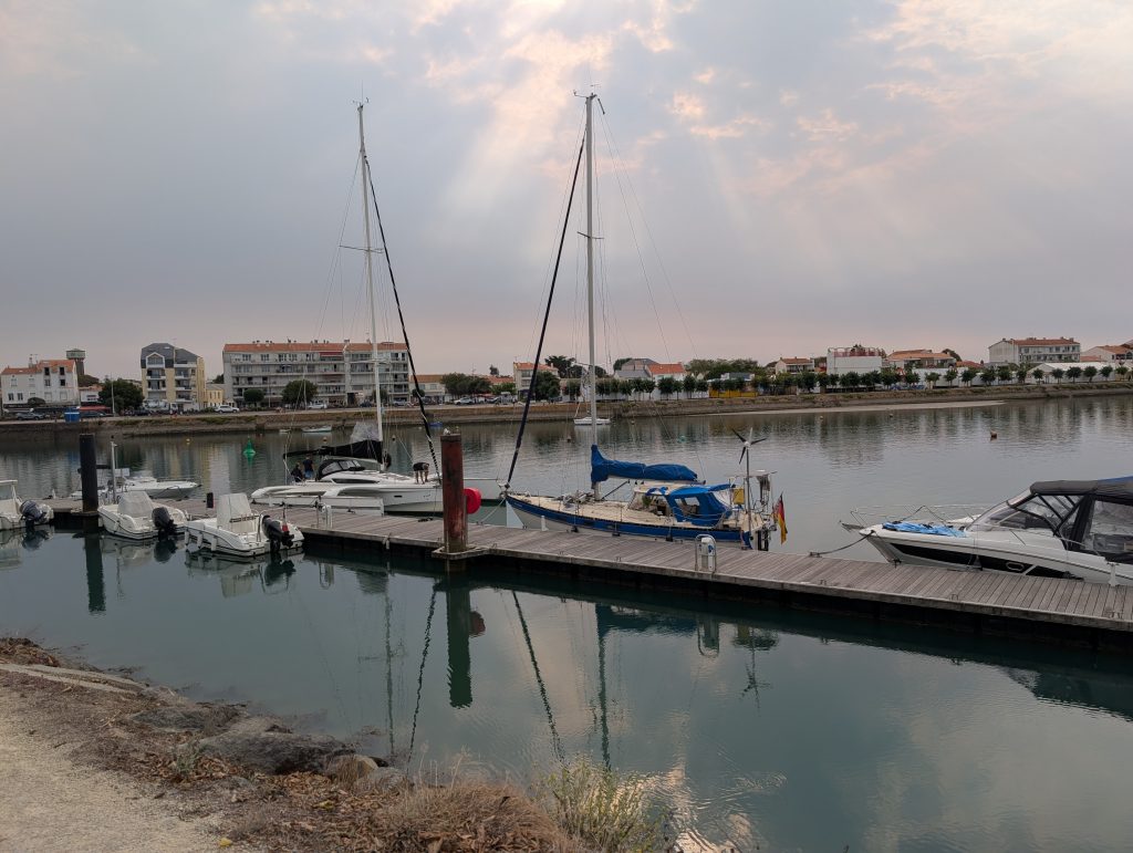 Am 17. August sind wir nach Saint-Gilles-Croix-de-Vie, oder kurz Port La Vie gefahren. Der Trip war 35 sm lang und verlief eigentlich unspektakulär, die Zeit segeln und motoren teilten sich je zu Hälfte auf. Etwa 1,5 Stunden vor Niedrigwasser sind wir im Hafen eingelaufen, die Stömung war erheblich, weil das ein Fluss ist. Da läuft bei Ebbe das Wasser rein und bei Flut wieder heraus, aber mit einer deutlich höheren Fliessgeschwindigkeit wie in anderen Häfen, dies war in Benodet das Selbe. Wir haben einen Liegeplatz im Voraus gebucht und an dem Steg seitlich festgemacht. An diesem Abend blieben wir auf dem Boot und haben es uns dort gemütlich gemacht. Am nächsten Tag sind wir in die Stadt gegangen und sind durch die Straßen geschlendert. Wir laufen gerne durch die Straßen, in denen die Leute wohnen, dort sieht man das wirkliche Leben in einer Stadt. Natürlich durfte ein Besuch des Supermarktes und der Fußgängerzone nicht fehlen. Die Stadt und die Gegend dort ist sehr schön, wirklich ein Besuch wert. Hier in Saint-Gilles-Croix-la Vie lebte ein Mann mit dem Nachnamen Bénéteau der hat irgendwann mal auf die Fischerboote ein Segel konstruiert damit die nicht mehr rudern mussten, so sind dann die Segelboote entstanden die heute noch unter dem Namen Bénéteau gebaut werden.