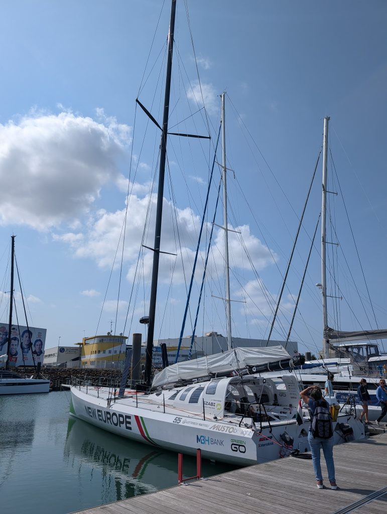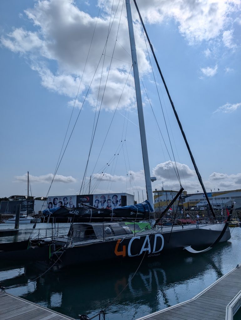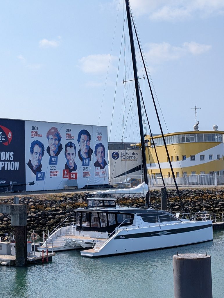 Auf diesem Bild an der Halle von Privilege, sieht man Teilnehmer der Vendee Globe mit der Jahreszahl und den benötigten Tagen (z.B. 2008 84 Jours/Tage) und 2024 nur noch 64 Jours/Tage). Für mich ist das eine gewaltige Entwicklung.