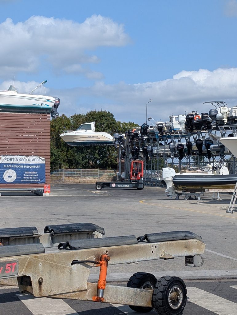 Hier stehen Regale, in welche die Boote einfach mit dem Stapler reingeschoben werden, und schon sind die aufgeräumt.