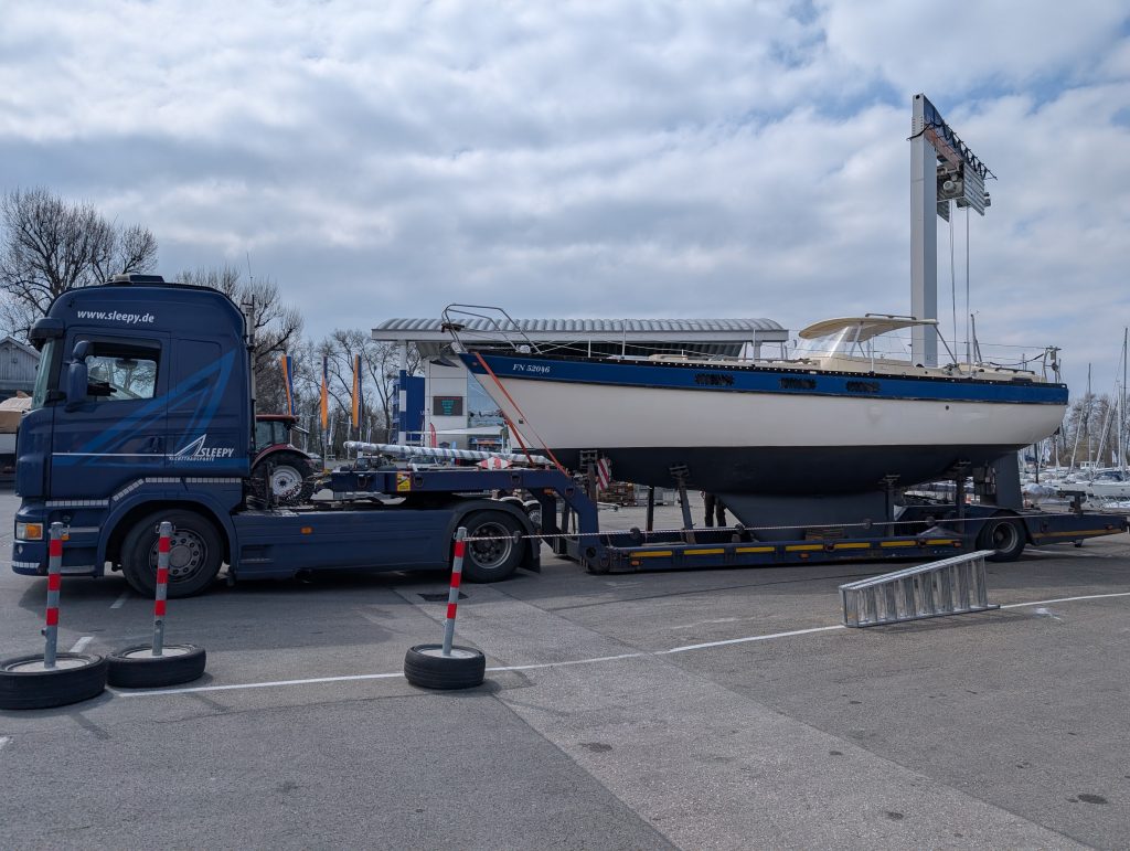 Am 28. März war Heike mit zwei Freundinnen im Hafen und hat unser Boot verabschiedet. Sie haben den Mast in Luftpolsterfolie eingepackt um Schmutz und Nässe fern zu halten. Die letzten Kleinigkeiten wurden noch im Boot verstaut und dann kam der LKW und das Boot wurde zum Transport auf den LKW verladen. Alles wurde sehr gründlich verladen und befestigt, wir haben bei der Firma Sleepy aus Kiel ein sehr gutes Gefühl. Das Boot soll spätestens am Montag in Kappeln ankommen und wird dort dann wieder auf einen Bock gestellt und geht dann in die Werft Peter Wrede Yachtlackierungen zur Überholung des Unterwasserschiffs. Anbei noch ein Bild und ein Video als das Boot den Hafen verlässt.