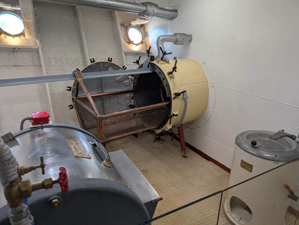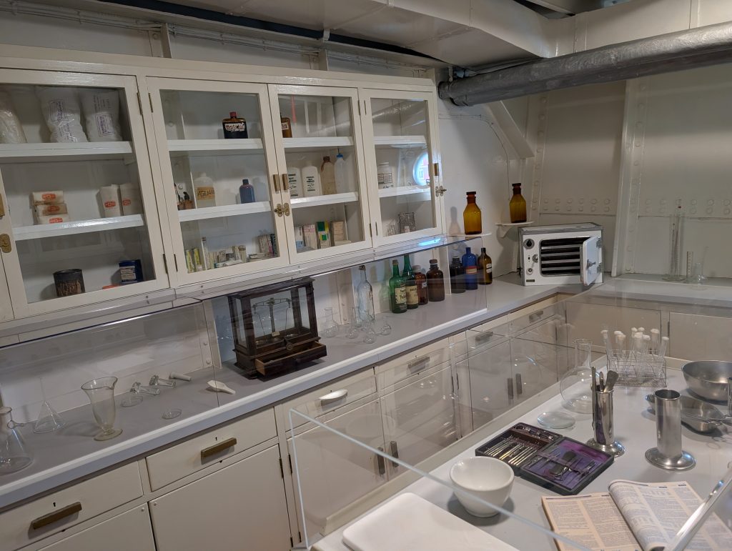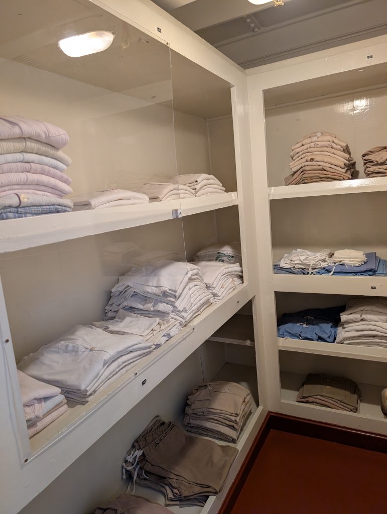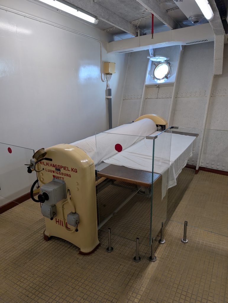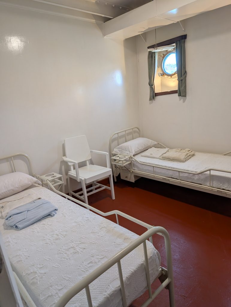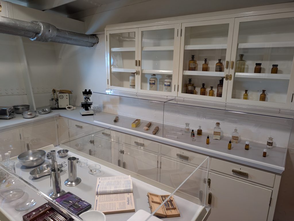 Am Sonntag 8. März waren wir das Museumsschiff die Gil Eannes besichtigen. Dies war ein Versorgungs- und Hospitalschiff welches unterwegs war fast genauso wie ein Krankenhaus nur schwimmend. Sie wurde 1955 gebaut und war unterwegs die Fischer ärztlich zu betreuen. Zur ärztlichen Versorgung konnten sich die Fischer an Bord auch die Haare schneiden lassen, das war eine Zusatzleistung die, glaube ich, nichts extra gekostet hat. Das Schiff hatte zum ärztlichen Untersuchunszimmer auch die Möglichkeit Röntgenaufnahmen zu machen die vor Ort dann auch gleich entwickelt wurden und dem Arzt dann zur Verfügung standen. In einem Raum der sich ganz unten im Schiff befand, um möglichst wenig Bewegungen zu erfahren, befand sich der OP-Raum. Im Vorraum haben sich die Ärzte die Hände gewaschen und desinfiziert, angekleidet und sind durch eine Türe in den OP Raum gelangt um notwendige Operationen durchzuführen. Die Patienten welche im Bett liegen mussten lagen auf Stationen welche 24 Stunden betreut waren, natürlich die unteren und oberen Ränge getrennt.