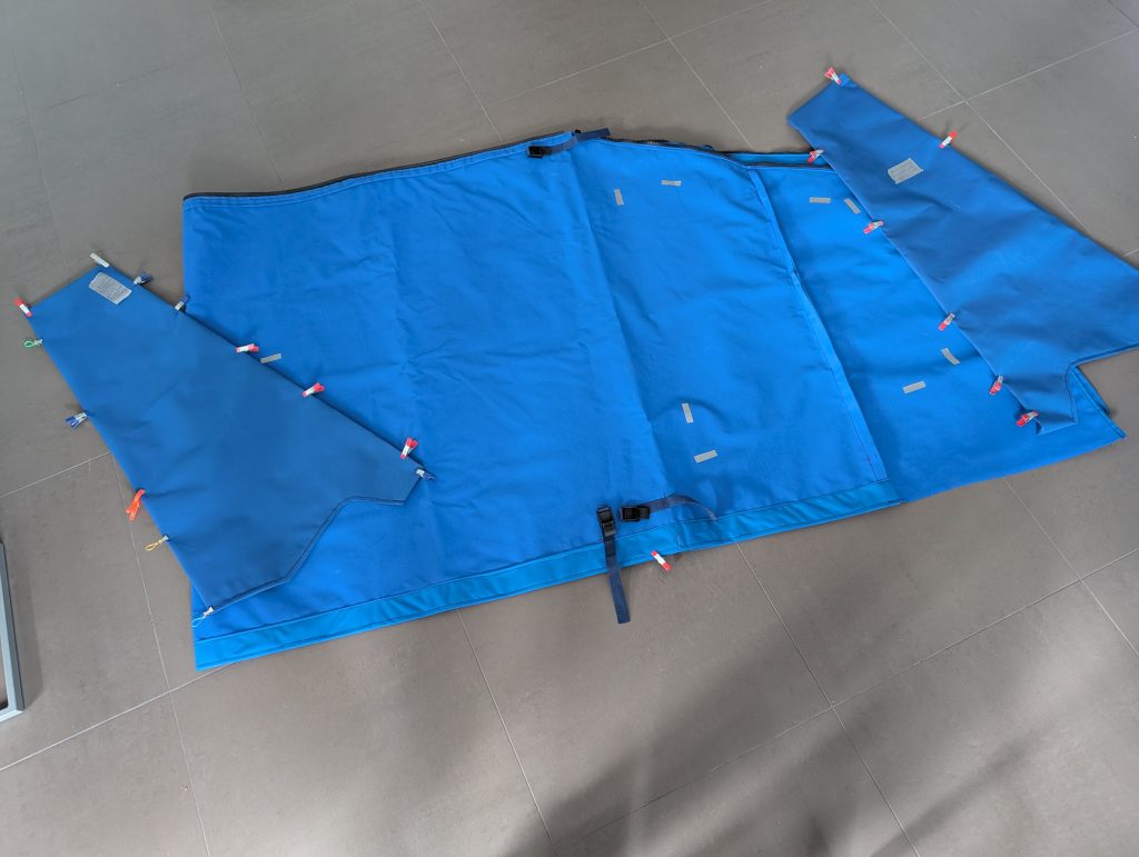 Nachdem unser festes Dach auf unserem Boot moniert und mit dem Geräteträger verbunden ist, können wir nun eine Kuchenbude nähen. Da unser Boot ja nun nicht das größte ist, können wir hiermit unseren Wohnbereich erweitern und sind vor schlechtem Wetter geschützt. Als wir vor Jahren eine Sprayhood anfertigen ließen, haben wir dem Profi ganz genau auf die Hände geschaut, wie so etwas gemacht wird. Zuerst werden die einzelnen Teile aus Folie angepasst, damit man ein Schnittmuster hat. Erst dann wird der Stoff ausgeschnitten. Da wir eben keine Profis sind, machen wir immer einen Teil nach dem anderen. Ich nähe mit einer Singer Nähmaschine, die extra für dicke Stoffe geeignet ist. Hiermit kann ich dann auch auf dem Boot nähen und immer gleich das nächste Stück anpassen und annähen. Wir werden euch noch mehr Bilder vom Nähfortschritt zeigen. Die Nähmaschine werden wir übrigens auch auf unserer Reise mit an Bord haben.