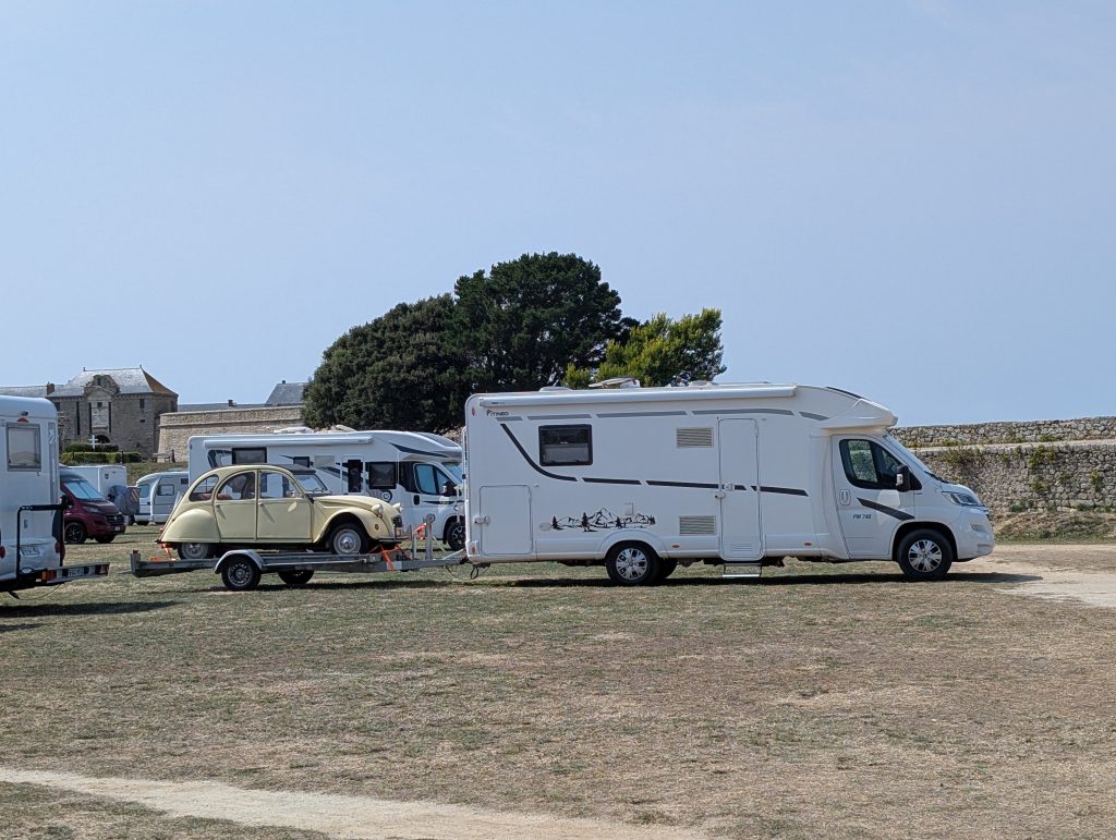 Wohnmobil Stellplatz in Port Louis, in Deutschland steht ein Smart drauf, in Frankreich halt eine Ente 2CV, cooles Gespann.