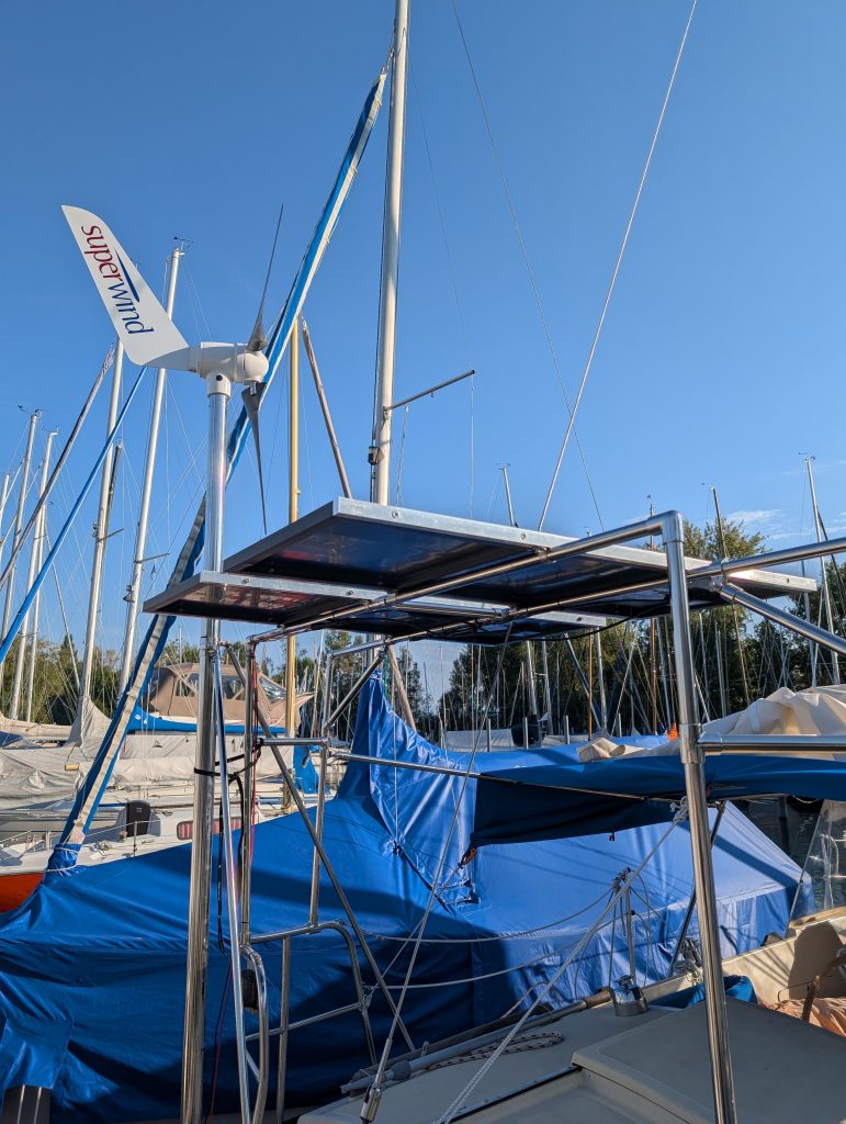 Wir haben auf unserem selbst gebauten Heckträger 2 Solarmodule mit je 120 Watt und einen Superwind- Windgenerator installiert. Wir denken, dass wir somit auch außerhalb des Hafens gut mit Strom versorgt sind. Wir achten jedoch auch darauf, dass wir konsequent unseren Stromverbrauch reduzieren. Beleuchtung wurde auf LED umgestellt und es wurde auch auf manchen Komfort verzichtet, wie z.B. eine elektrische Toilettenspülung oder eine Kaffeemaschine. Der Kaffee wird eben von Hand gefiltert. Wichtig ist uns, dass unsere Navigationsgeräte und Kommunikationselektronik jederzeit mit Strom versorgt ist.
