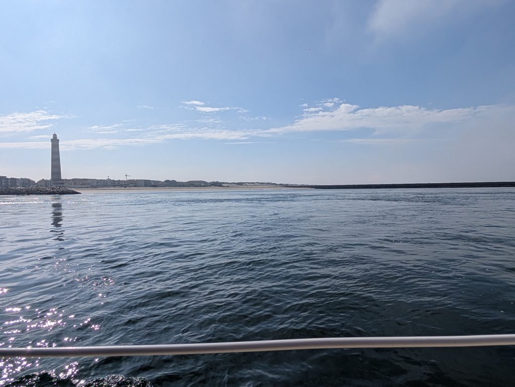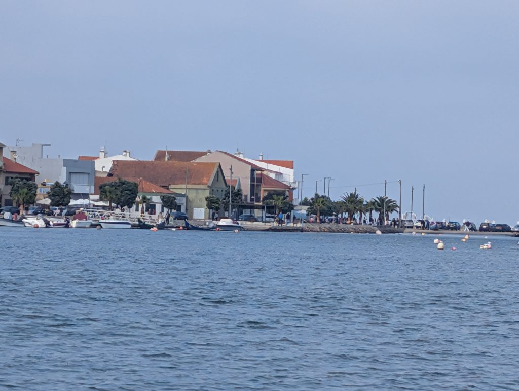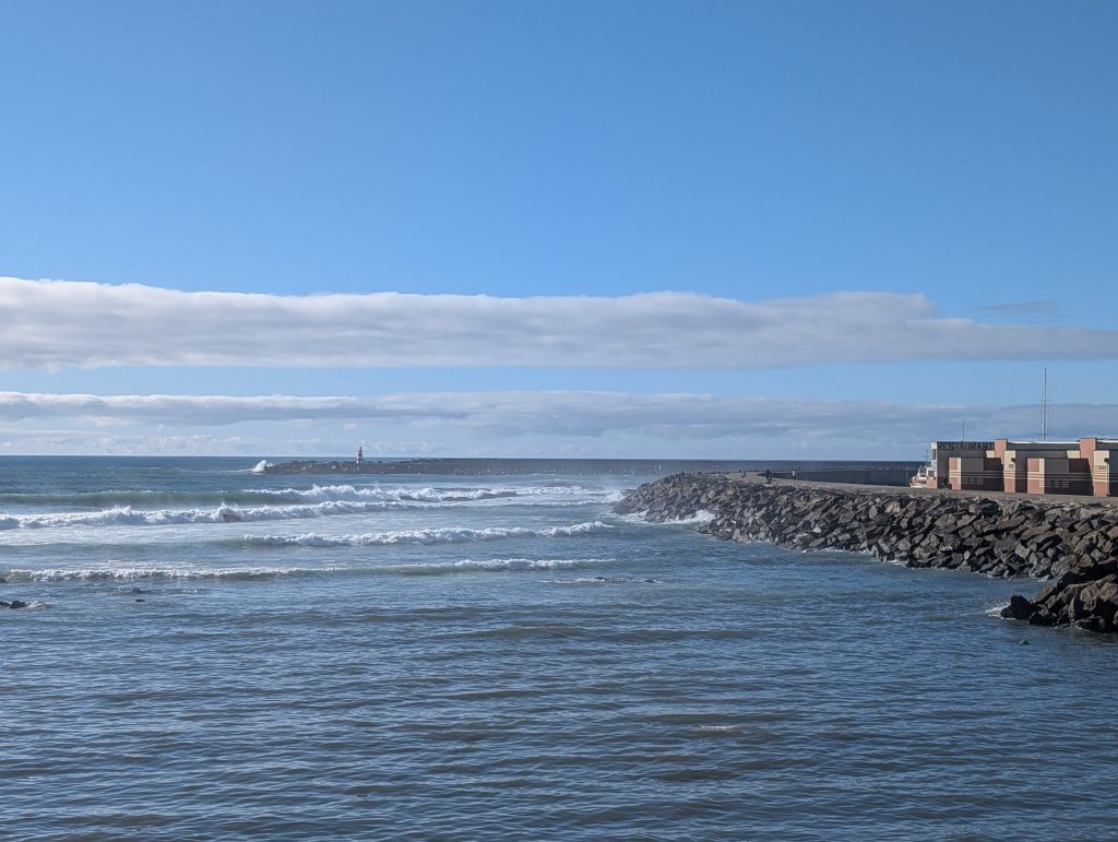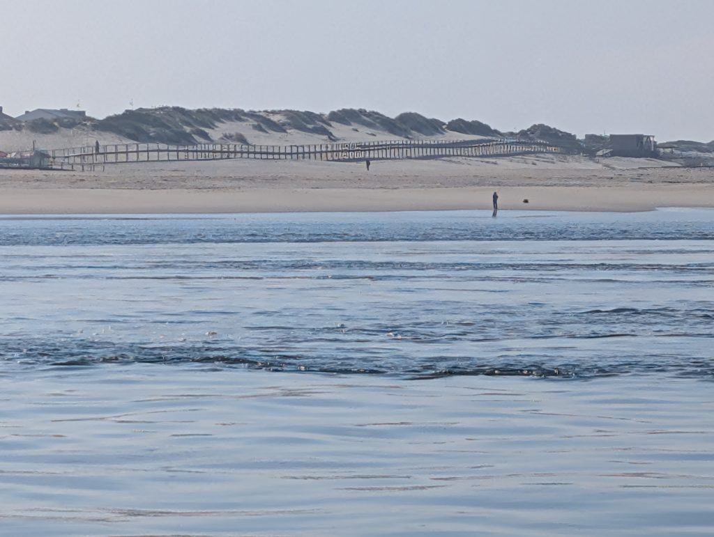 Hafeneinfahrt in Aveiro, man sieht das kabbelige Wasser.