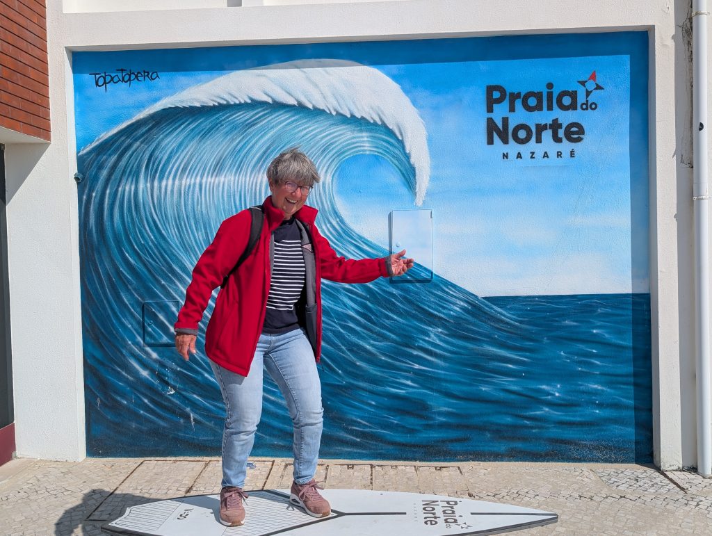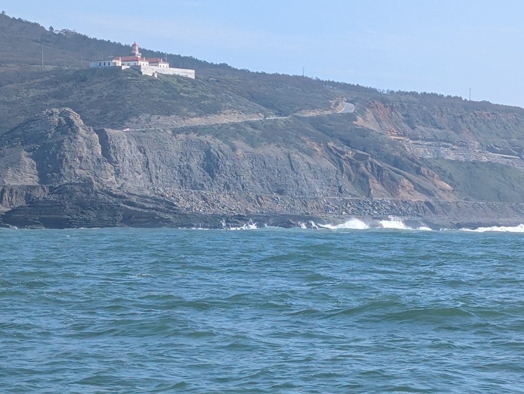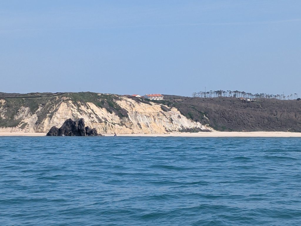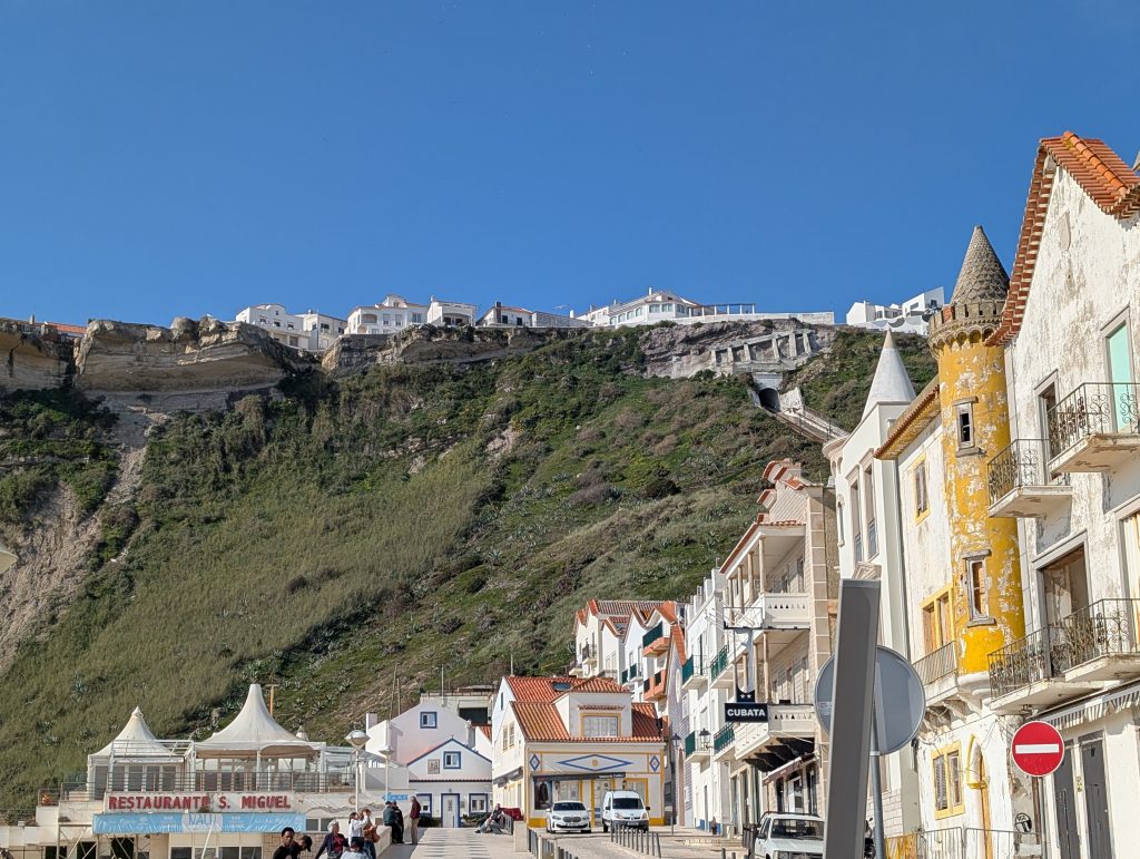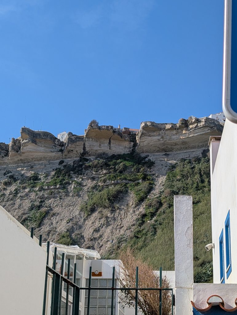Hinter diesem Felsen liegt links Nazaré. Von diesem Ort werden immer die spektakulären Bilder der riesigen Wellen geschossen.