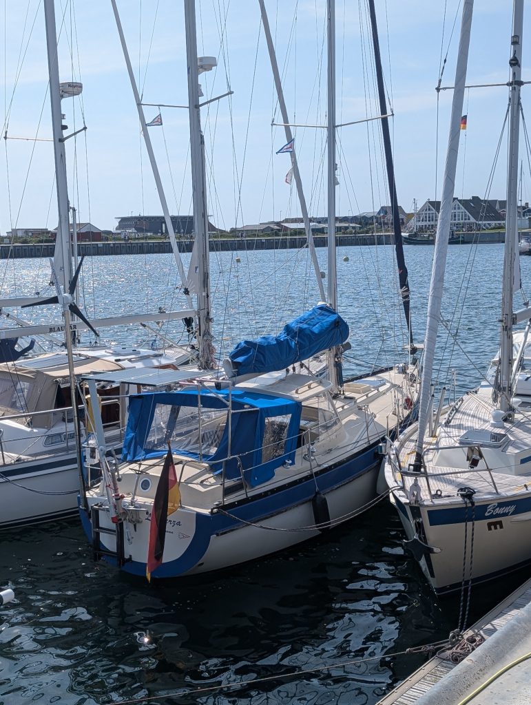 Am Mittwoch morgen um 6:00 Uhr haben wir dann in Helgoland losgemacht. Seit Cuxhaven sind wir in einer Flotille aus drei Booten unterwegs, ein Boot auch von der TO mit ähnlichem Ziel, und ein Boot mit einem französichen Ehepaar (die haben in Schweden ein Boot gekauft und überführen das jetzt nach La Trinite in Frankreich). Leider hat dann zum Schluß der Wind nicht mehr gepasst, und im Hinblick auf das Hochwasser in Norderney (unser Zielhafen), haben wir dann unseren Motor angeworfen und sind mit 5,5 Knoten Richtung Norderney gefahren. Das Problem war, dass wir nur in einem Zeitrahmen von 4 Stunden ohne Probleme in die Zufahrt des Hafens einlaufen konnten. Nach dem Festmachen und dem Gang zum Hafenmeister sind wir dann noch kurz alle drei Boote miteinander zum Einkaufen gegangen und anschließend noch auf unserem Boot zusammengesessen und haben beratschlagt wie die Fahrt weiter gehen soll. Dabei kam es zu dem Entschluss am nächsten Tag, gegen 15:30 Uhr in Norderney abzulegen und nach Borkum zu fahren, dies liegt schon einige Seemeilen in die Richtung, in welche wir wollen. Die Planung gab uns vor, gegen 21 Uhr dort anzukommen, da ist wohl was schief gelaufen, es wurde eine Ankunft um 23:45 Uhr, aber das ist kein Problem man nimmt es so wie es kommt. Am nächsten Vormittag haben wir uns dann noch mit der Tochter (mit Freundin und Kindern) unserer Nachbarn getroffen, die waren zu selben Zeit in Norderney in Urlaub. Danach noch in den Ort rein durchgeschlendert, mit einem Eis bewaffnet und wieder zurück aufs Boot, Boot vorbereiten und raus aus dem Hafen Richtung Borkum. Auf den ostfriesischen Inseln braucht man sehr viel Zeit um in den Hafen zu kommen, oder wieder raus zu fahren. Nachdem wir draußen dann umsere Segel gesetzt hatten war uns allen klar so wird das nichts, und ohne Absprache hat jeder zu den Segeln auch noch den Motor mitlaufen lassen, mit den Segeln hatten wir bei dem Wellengang, Stabilität im Boot und mit dem Motor den Vortrieb. So sind wir dann am 19. Juni in Borkum im Hafen angekommen, es ist ein Industriehafen und nicht sehr schön. Da der Ort sehr weit weg ist, haben wir es nicht geschafft dort noch etwas bummeln zu gehen, leider. Unsere Zeit des Ablegens kam sehr schnell näher und es war noch das Eine oder Andere zu erledigen.